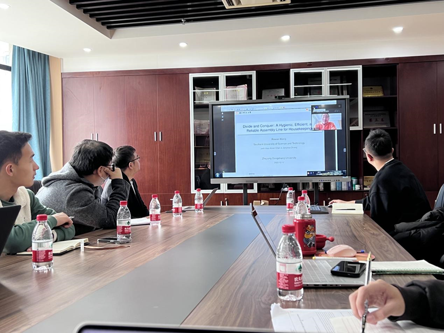 2022年12月12日下午,南方科技大学王宇教授应邀在腾讯会议(ID:791-504-601)开展了一场题为“Divide and Conquer: A Hygienic,Efficient, and Reliable Assembly Line for Housekeeping(流水线式客房清洁流程设计)”的学术讲座。本次讲座采用线上线下相结合的方式,线下讲座在综合楼615会议室举行,由统计与数学学院张崇辉教授主持,统计与数学学院部分老师和研究生参加了此次讲座。