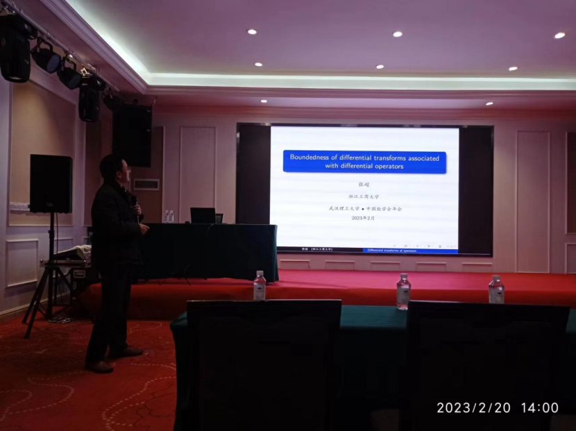 2023年2月18日至2月22日,中国数学会学术年会在武汉理工大学召开。我院张超副教授代表浙江工商大学统计与数学学院应邀参加本次学术年会,并以《Boundedness of differential transforms associated with differential operators》为题做实分析与复分析分组报告,向与会专家介绍了其近年来关于微分变换算子有界性方面最新研究工作。