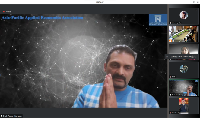 统计与数学学院顾文涛教授和日本早稻田大学Watada教授主持会议主题报告,日本早稻田大学Watada教授、台北商业大学黄焜煌教授、澳大利亚蒙纳士大学Narayan教授、澳大利亚迪肯大学Sharma副教授分别进行题为《From the categorical data analysis to the linguistic data analysis》《Causal complexity analysis for fintech adoption》《Structural Breaks in Interactive Effects Panels and the Stock Market Reaction to COVID-19》《Does green activity impact stock price crash risk? The role of climate risk》的主题汇报。其中,国际计量经济学知名学者、《Emerging Markets, Finance &Trade》SSCI期刊主编澳大利亚蒙纳士大学Narayan教授对交互固定效应模型中结构变点的识别及其变点区间的估计进行介绍,并将其应用在新冠疫情对股票市场冲击的实例中,同时提供了一套简便且有效的方法并配备工具箱供大家使用。大会主题报告专家并就参会学者提出的问题做出细致解答和讨论。