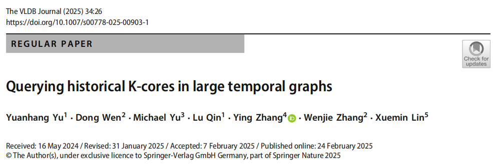 近日,我院张颖教授与悉尼科技大学、新南威尔士大学、香港中文大学、上海交通大学团队合作在我校A+++期刊《VLDB JOURNAL》上发表了题为“Querying historical K-cores in large temporal graphs”的学术论文。浙江工商大学统计与数学学院是本论文通讯作者单位。